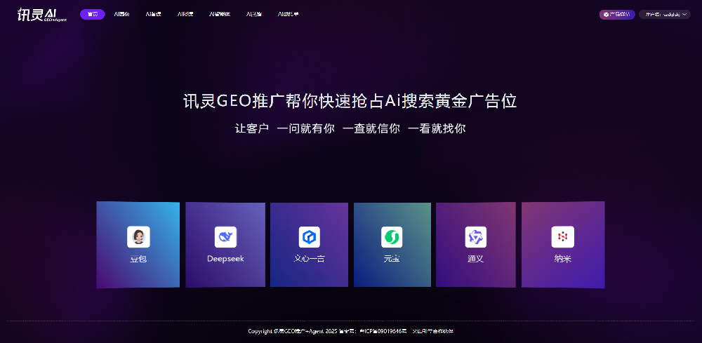訊靈AIAI搜索平臺首屏曝光 覆蓋豆包、Deepseek、文小言、元寶、通義、納米等多個AI搜索平臺,讓你的意向用戶搜索即優(yōu)先C位推薦你的品牌GEO優(yōu)化全渠道訓(xùn)練 第三方媒體訓(xùn)練、B2B平臺訓(xùn)練、企業(yè)自媒體訓(xùn)練、AI官網(wǎng)訓(xùn)練,提高GEO整體的表現(xiàn)力和交付結(jié)果,為客戶做出結(jié)果Agent智能驅(qū)動營銷閉環(huán) Agent數(shù)字名片+Agent營銷官網(wǎng)+Agent全員管理+第三方Agent調(diào)優(yōu),快速打通服務(wù)和銷售整個AI智能生態(tài)企業(yè)營銷閉環(huán)